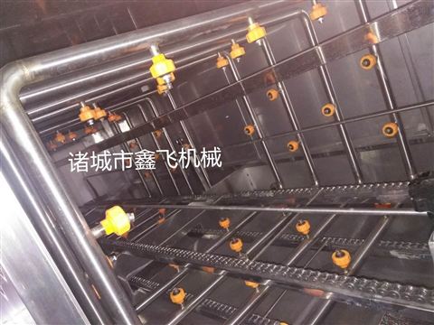 周轉(zhuǎn)筐清洗機設(shè)有氣泡發(fā)生裝置,利用氣泡的上下翻滾將蔬菜上殘留的泥沙和殘留農(nóng)藥等雜質(zhì)清洗干凈,并配有網(wǎng)帶輸送裝置可以將被清洗的蔬菜不斷向前推進,在出水面的時候會有噴淋裝置對蔬菜進行高壓沖洗進一步把蔬菜上的殘留雜質(zhì)清洗一遍,在蔬菜清洗機的末端裝置一個風機可以將蔬菜表面的水分吹掉一部分,更方便了下一步的加工。